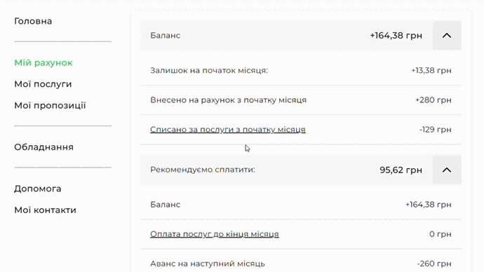 Навпроти посилання «Списано за послуги з початку місяця» Ви можете побачити загальну суму оплат з початку місяця.