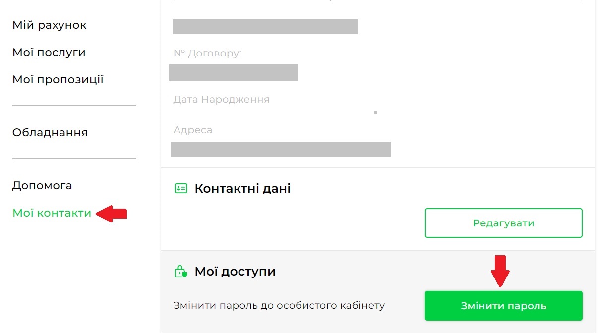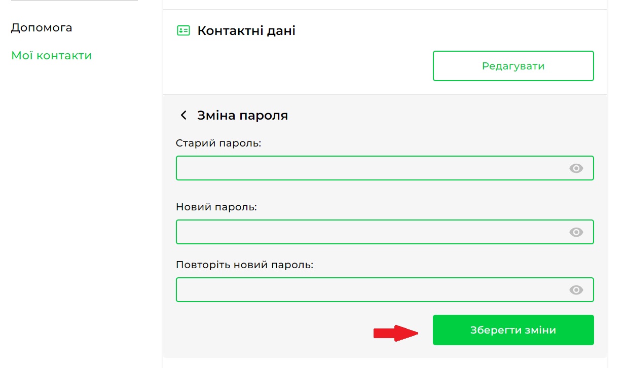 В особистому кабінеті перейдіть у розділ «Мої контакти», далі в блок «Мої доступи» та натисніть «Змінити пароль». У відповідному полі введіть старий пароль, далі створіть новий пароль, повторіть новий пароль в нижньому полі і натисніть «Зберегти зміни».